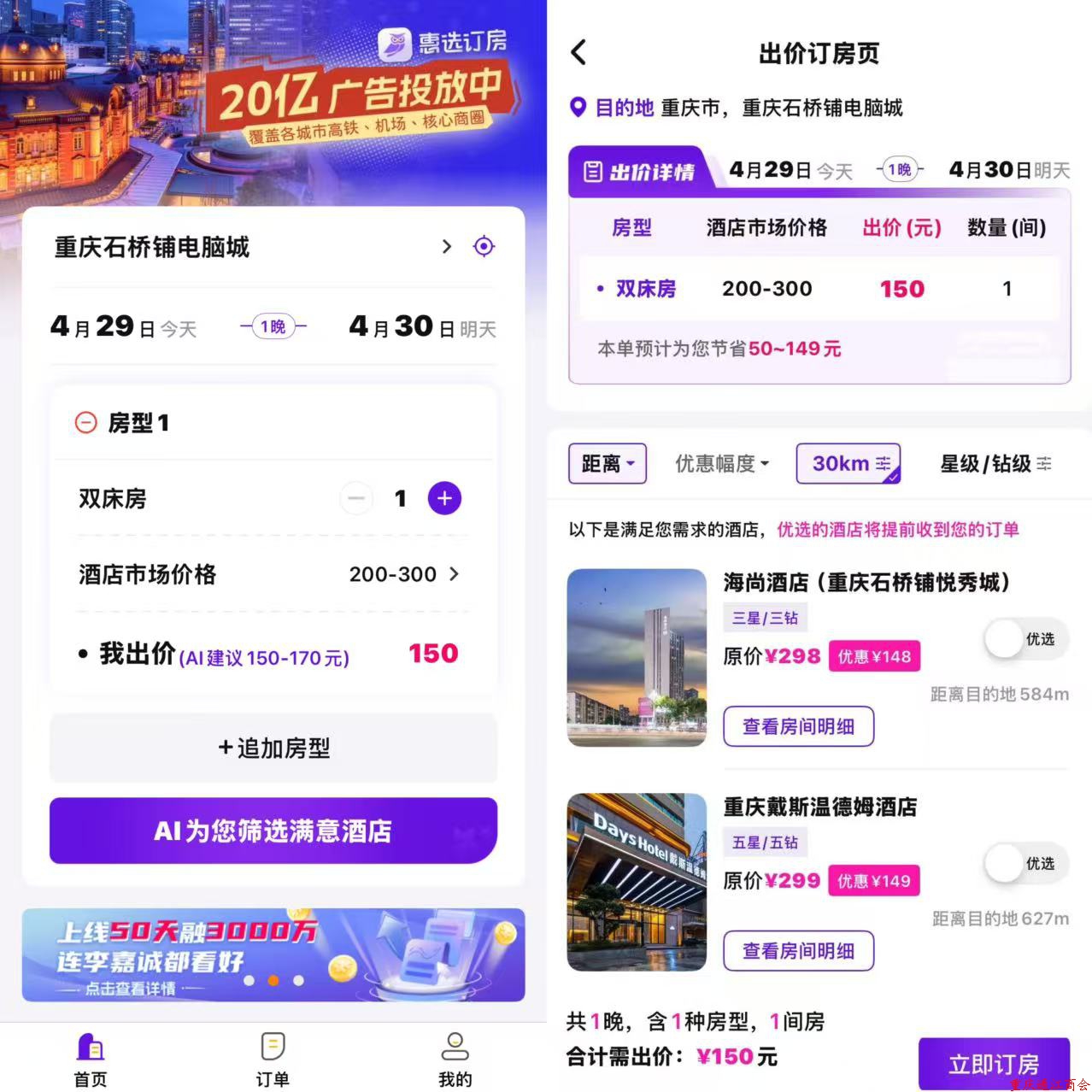 例如,一位从四川巴中计划前往重庆旅游的游客,他通过惠选订房平台,输入“重庆九龙坡区石桥铺,双床房,价格区间200-300元,三星级酒店”这些条件后,平台依据当时当地的酒店行情评测,人工智能AI智能给出一个150元-170元的出价建议。订单随后同步发送给周边符合条件的多家酒店,那些入住率还有空余、希望增加额外收入的酒店看到订单后,就会考虑是否抢下这笔特价订单。